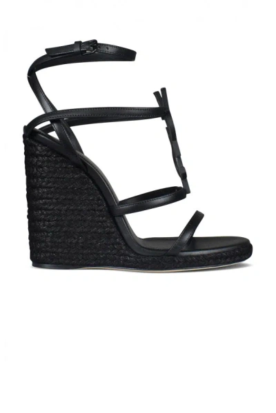 Saint Laurent Cassandra wedge espadrilles in smooth black leather with a hessian heel. Thin straps decorated with the YSL initials in black metal and an adjustable buckle. Heel height 11.5 cm. Leather sole. Buffalo leather. Made in Italy.