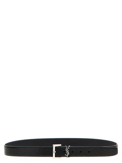 Leather belt with adjustable square buckle and silver metal Cassandre loop. Composition: 100% leather