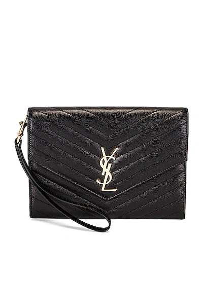 Saint Laurent Monogramme Clutch in Noir - Black. Size all. Quilted leather with grosgrain lining and polished gold-tone hardware. Made in Italy. Measures approx 8W x 6H x 1D. Fold-over flap top closure with magnetic fastening. Interior slot pocket. Detachable wrist strap. Interlocking logo hardware at front. SLAU-WY1375. 617662-BOW01-1000. About the designer: SAINT LAURENT has been influencing and revolutionizing the fashion industry since the debut of its iconic ‘Rive Gauche’ collection in 1966 - the couture house was the first to create a ready-to-wear capsule. The sleek, precisely tailored staples, like the signature biker jackets, transcend seasons and trends. Creative Director Anthony Vaccarello continues to honor the label’s illustrious reputation by reintroducing cult styles, including the ‘Lou’ handbag and ‘Tribute’ sandals.