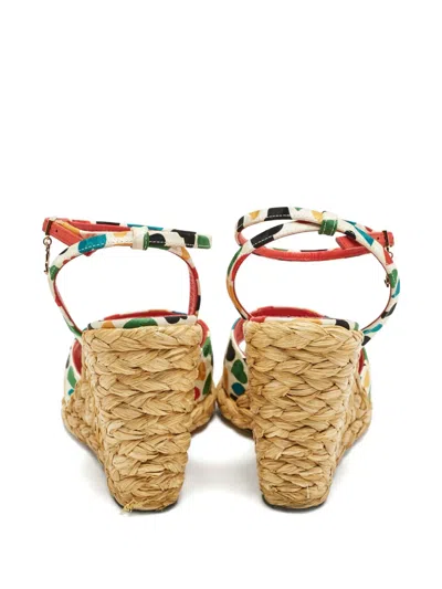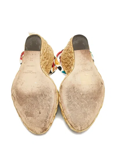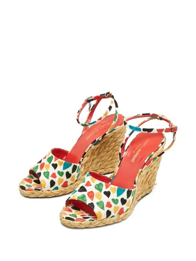 white and multicolour heart print raffia platform leather insole leather ankle strap buckle closure Condition: GOOD. This previously owned and used item is in good condition with minimal signs of use. This may include fading of material or plating and scratches.