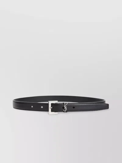 Adjustable design | Multiple holes | Black leather belt | Tonal stitching | Metallic signature YSL belt loop | Silver-tone metallic buckle | Adjustable buckle | Metal buckle