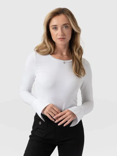 Buy the Connie Cuff Tee . From our Women's Tops here at Saint and Sofia. Fit: True to size. Look: Slim fit crew neck long sleeve tee with woven cuff detail. Slim fitting. Length: 62cm from shoulder to hem. Material: Main Fabric: 95% Eco Viscose 5% Elastane Contrast: 100% Cotton Model: 5'8" wearing size UK 8. Origin: Handmade in Europe. Care: Machine wash.