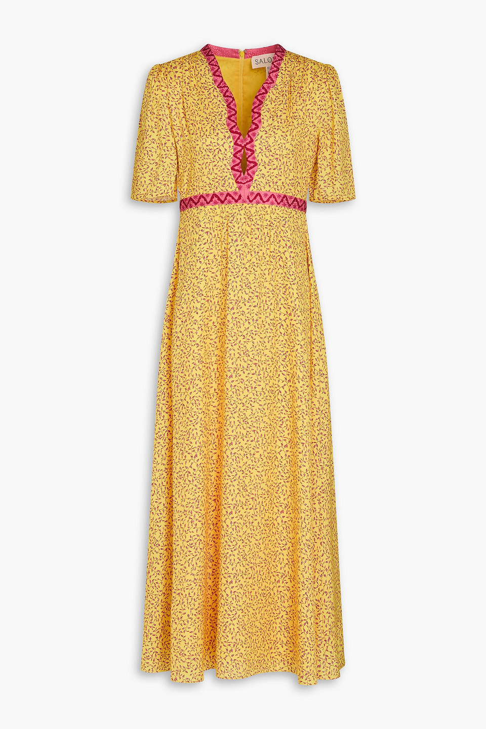 The perfect length dress does exist.Meet the SALONI Tabitha Midi Dress in Ambra Sunrise, a stylish choice for summer events with its short puff sleeves. This elegant dress is crafted from 100% silk, presenting a luxurious feel in a trendy midi length. Featuring a flattering empire waist and a keyhole neckline, it secures with a concealed center back zip fastening. Care - Dry clean only; avoid contact with suntan lotion, oils, and harsh chemicals for best maintenance.