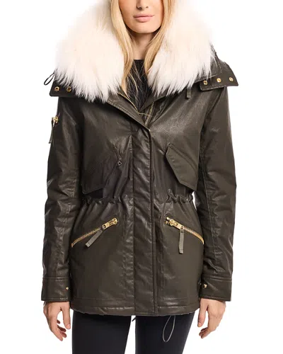 Sam. Devon Shearling Trim Parka.Color:Military/White.Size:XL.Material:Shell: 70% cotton/30% polyurethane; fill: 100% polyester; lining: 100% polyester; real lambskin shearling, origin: Spain, dyed.Jackets.
