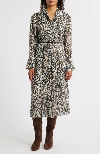 An abstract print brings mesmerizing pattern to this long-sleeve shirtdress cinched with a slim belt that offers a waist-accentuating finish. Front button closure Spread collar Long sleeves with button cuffs Removable belt Lined 100% polyester Dry clean Imported