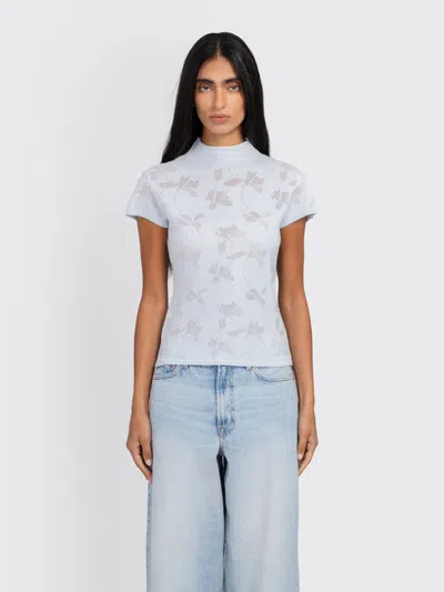 Knitted top with a slim fit and sheer floral jacquard. High neck. Main material made from a blend including recycled polyester and cotton. Model is 5'8 and wears size XS.