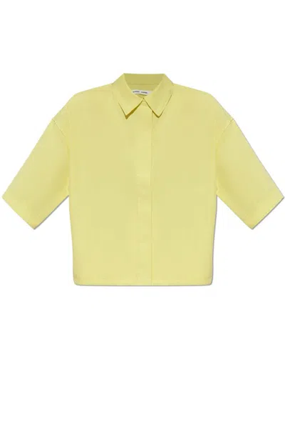 yellow recycled polyester blend classic collar concealed front button fastening short sleeves drawstring hem cropped This item is made from at least 50% recycled or upcycled materials. For recycled synthetic clothing products, we highly recommend using a microfibre-catching washing bag to ensure that no microplastics that can pollute water are released in the process. Learn more about what makes a product Conscious on our Conscious Criteria page