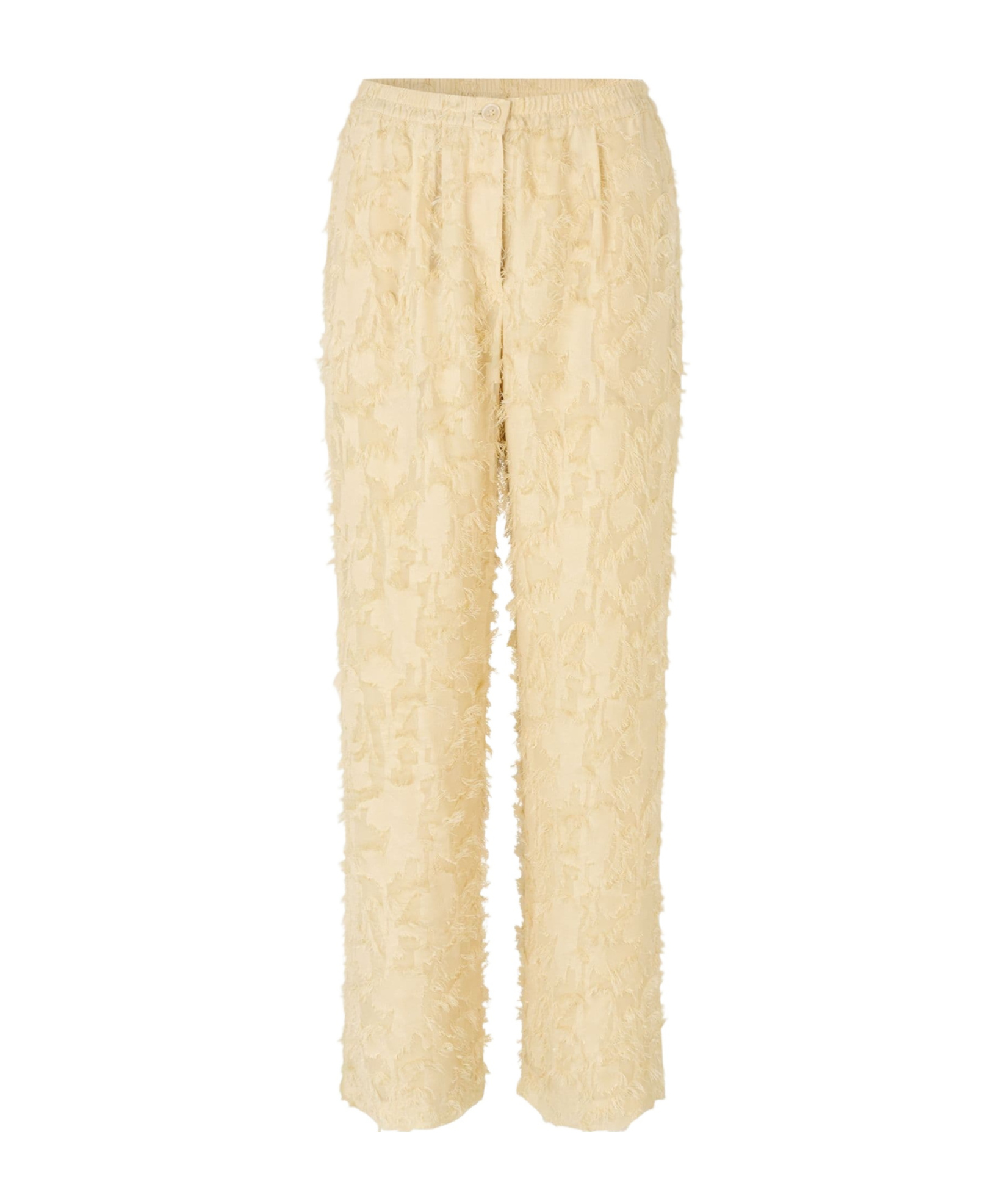Straight mid-rise with button and zip fastening, elastic waistband and side slit pockets on the front.
