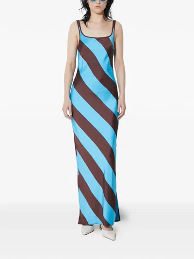 light blue and brown stripe print strap neck side slit maxi length straight silhouette
