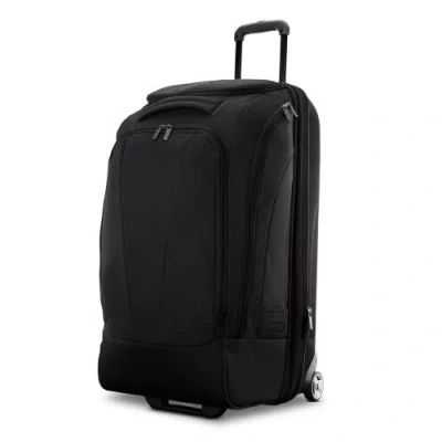 With multiple easy access compartments for organization, this wheeled duffel is perfect for every adventure no matter the duration. This style is designed using two different materials, a durable molded backside paired with a soft side material on the front. Telescopic handle adjusts to 3 heights. Double-wheel casters provide smooth stable motion and are secured with internal support plates for superior durability. Easy access front zip compartment with interior mesh zip pocket. Large main compartment. Interior zip-around mesh panel pocket with 2 separated large zip pockets. Expands 3-inches. Packing compartments feature 2 sections: (1) Top zip compartment includes a mesh zippered storage pocket and 2 compression straps with adjustable buckles to secure items during travel (2) Bottom compartment features 2 large mesh storage pockets and an open, large capacity packing section. Unzip the middle section dividing the top and bottom compartments for maximum packing capacity, perfect for extra-long trips Exterior features 3 pockets located on the top and both sides to easily access items without having to unzip the main packing compartments