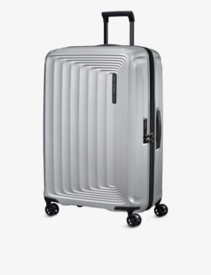 Samsonite shell suitcase100% polycarbonateExposed zip closureTop and side handles, retractable handle, branded plaque at front, silver-toned hardware, ribbed metallic panels, expandable depth, numbered pad-lock at side, four-way wheels, brand print at back handle, two compartments, elasticated compartment strap at interior, fully linedWeight: 3.6kgHeight 75cm, width 49cm, depth 30cmWipe cleanLimited 5 year global warranty