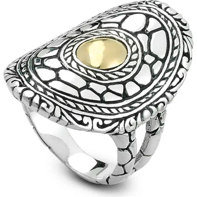 A pebble design defines this sterling silver ring enhanced with a gleaming 18-karat gold accent at the center. 19mmW x 19mmL setting Sterling silver/18k gold Imported