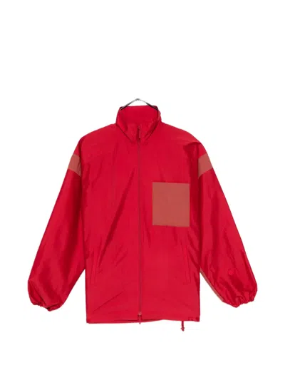bright red panelled design front zip fastening chest patch pocket round neck long sleeves two side welt pockets drawstring hem elasticated cuffs