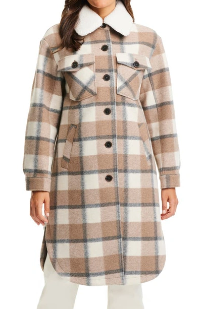 SANCTUARY Plaid Shacket With Removable Faux Shearling Collar In Brown Plaid