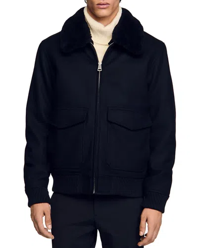 Sandro Aviator Jacket.Color:Black.Size:XS.Material:Main fabric: 70% wool/20% polyamide/10% cashmere; lining: 100% viscose; real sheep shearling trim, origin: Australia, dyed.Jackets.