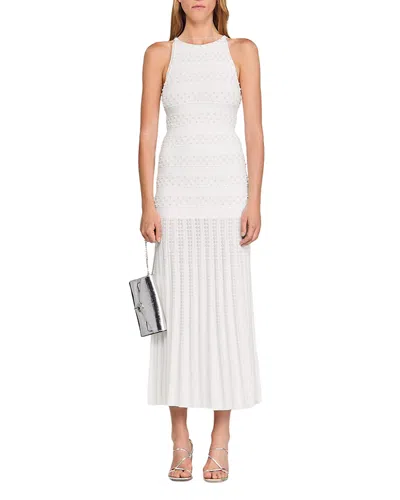 Sleeveless long striped and beaded knit dress with a round neck and pearl button fastening. Sandro Women's long knit dress Beaded stripes Round neck Sleeveless Pleated effect skirt Pearl buttons Lined top Flared fit The model is 5'9 tall and wears a size 4