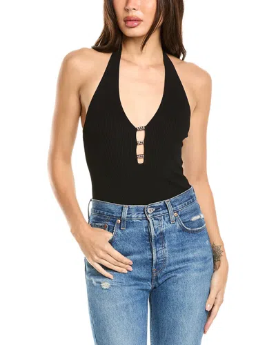 Introducing the Sandro Bodysuit, a Parisian chic piece that is sure to elevate your wardrobe. This black bodysuit features a ribbed halter design, plunge neck, and stunning rhinestone embellishment for added glamour. With a length of approximately 24 inches from shoulder to hem, this bodysuit is both stylish and comfortable. The slip-on styling and moderate seat coverage make it easy to wear for any occasion. Made with 64% Viscose, 21% Polyamide, and 15% Polyester, this bodysuit is hand washable and imported for your convenience. Channel effortless French elegance with the Sandro Bodysuit. Model is 5'10 and is wearing a size 1. Measurements may vary slightly by size.