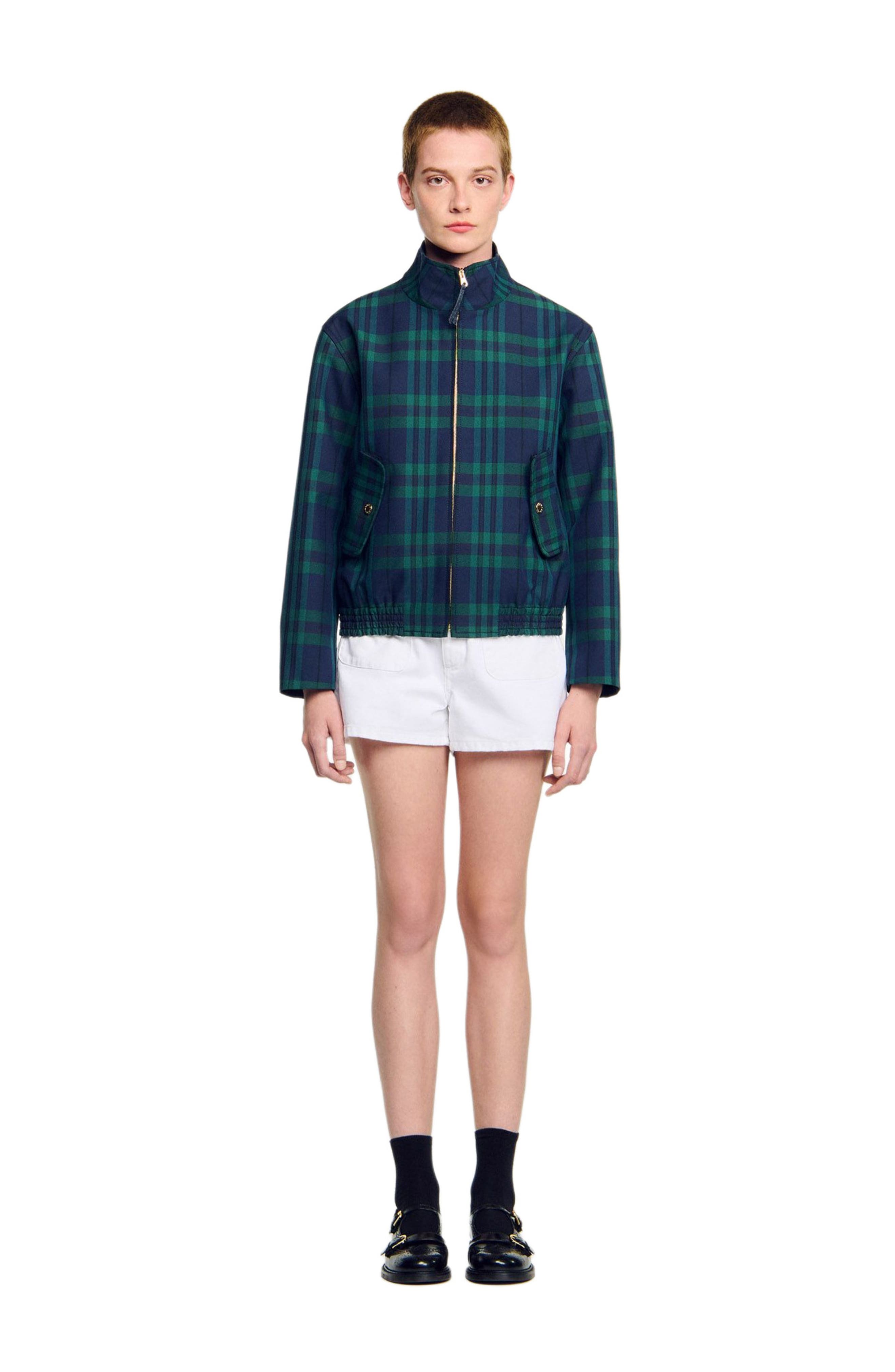 Cropped checked jacket with a stand-up collar, long sleeves, zip fastening, smocked waist and slanted flap pockets with metal press studs. Sandro Women's cropped checked jacket Stand-up collar Long sleeves Zip fastening Slanted flap pockets Elasticated hem with topstitching The model is 5'9 tall and wears a size 36