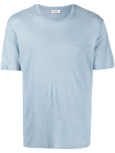 crew-neck linen T-shirt from SANDRO featuring baby blue, linen/flax, crew neck, short sleeves and straight hem. This item contains at least 50% materials which are certified or widely recognised as having a lower environmental impact through production and/or manufacturing processes that reduce water consumption and the use of harmful chemicals, or re-use by-products of the production process.. Learn more about what makes a product Conscious on our Conscious Criteria page.