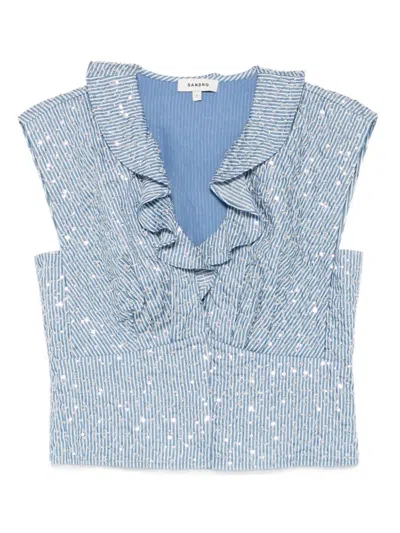 Striped sequin crop top with a ruffled V-neckline and a tie fastening at the front. Sandro Women's striped sequin-embroidered crop top Cropped fit Ruffled V-neckline Sleeveless Tie fastening and eyelets at the front Lined The model is 5'11 tall and wears a size small