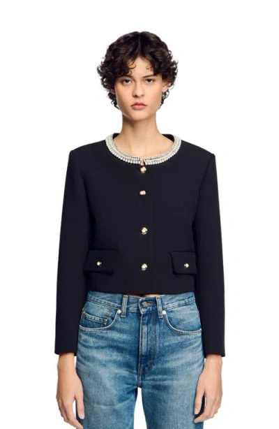 Short-sleeved jacket with beaded round collar, beads on button placket and pockets. This jacket matches the skirt Sandro Women's cropped jacket Round beaded neckline Long sleeves Button fastening with decorative buttons Flap pockets with buttons The model is 5'9 tall and wears a size 4