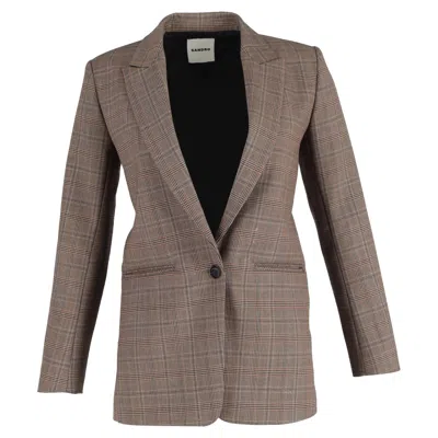 The Sandro Jada Plaid-Check Single-Breasted Blazer in Brown Polyester is a contemporary and versatile addition to your wardrobe. With its timeless plaid-check pattern, this blazer exudes sophistication and style. It features peaked lapels, long sleeves, and dual flap pockets at the waist, making it a chic and practical choice for both formal and casual ensembles. The single-button front adds a refined touch, while the classic peak lapels provide a polished look. Elevate your outfit with this Sandro blazer, perfect for adding a touch of tailored elegance to your everyday or professional attire.Sandro Jada Plaid-Check Single-Breasted Blazer In Brown PolyesterCondition - Very goodSigns of wear - Minor tarnishing of buttons., Minor sign of wear or markings., Lightly used but very well maintained. Small pull thread or light peeling.Packaging - NoneColor - Brown ochreMaterial - PolyesterSize - 34/XS/UK6Measurements - Length - 700; Chest - 400SKU - NAPPUGBCL399036W