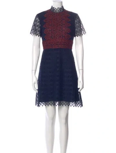 Sandro A-Line Dress Blue Lace Pattern Lace & Glitter Accents Short Sleeve with Mock Neck Concealed Zip Closure at Back Designer size 3. Designer Fit: Dresses by Sandro typically fit true to size. | Sandro Lace Pattern Mini Dress in Blue, Women's L
