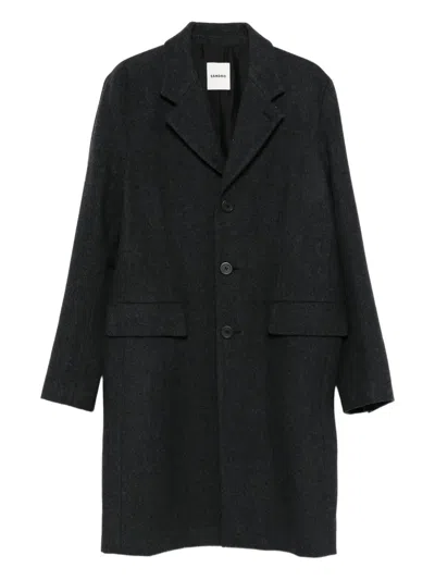 dark grey wool blend three button fastening patch pockets notched lapels long sleeves