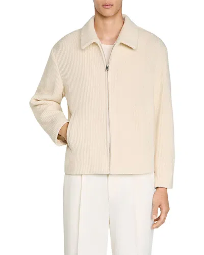 Sandro Minimal Knit Effect Jacket.Color:Ecru.Size:XX Large.Material:Main material: 38% wool/21% cotton/21% polyester/14% polyamide/3% other fibers/2% acrylic/1% viscose; sleeve lining: 100% viscose; pocket lining: 100% cotton.Jackets.