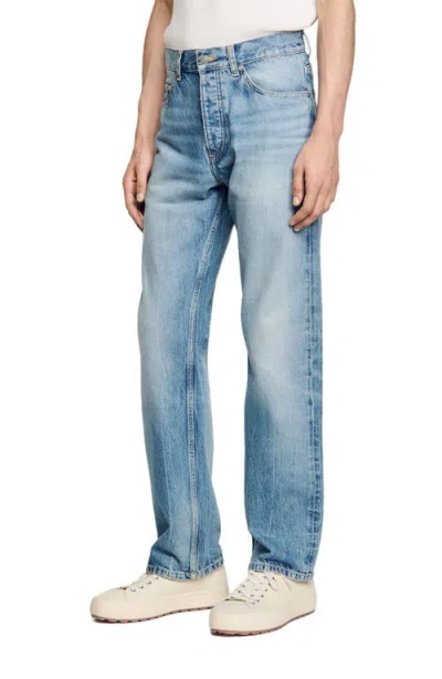 Regular-fit jeans with five-pocket design, leather jacron on the back, and faded details on front Sandro Men's regular jeans 5 pockets Leather jacron Faded and brushed effect on thighs The model is 6'1 tall and wears a size 30-31