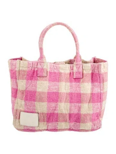 Sandro Tote Neutrals & Pink Plaid Print Gold-Tone Hardware Calf Leather Trim Rolled Handles Leather Trim Embellishment Canvas Lining & Single Interior Pocket Snap Closure at Top | Sandro Tote in Neutrals/Pink