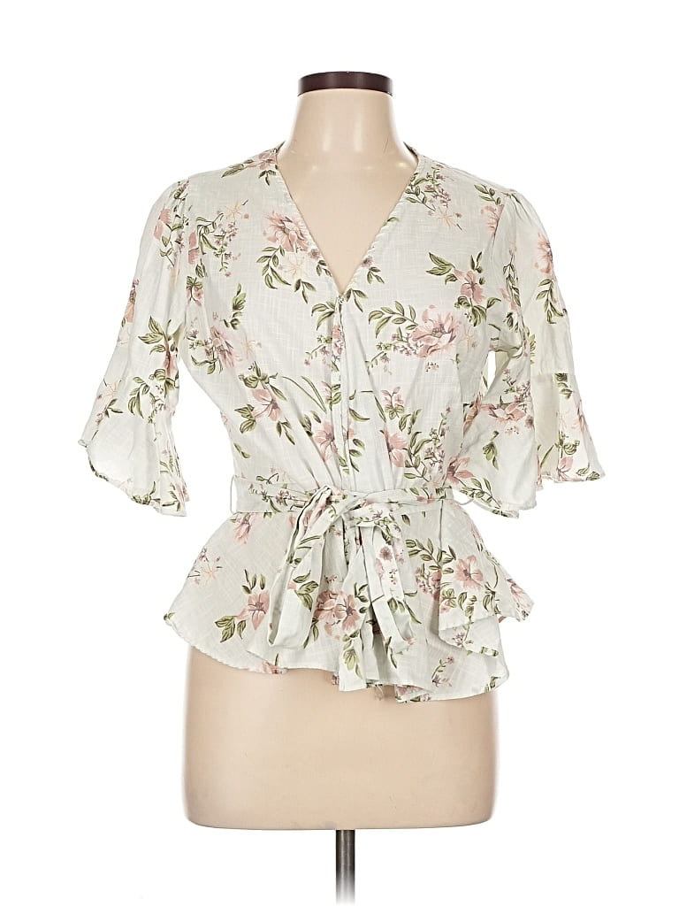 Sandy & Sid Short Sleeve Blouse, Size: Large. Item Details: Ivory, Floral Pattern, Plunge Neckline, Short Sleeves, Peplum, Women's Tops