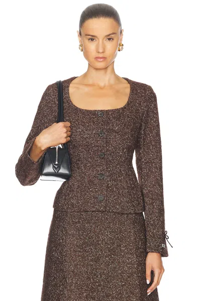 Sandy Liang Grappa Jacket in Dark Brown - Brown. Size 8 (also in 0, 2, 4). Self: 42% acrylic 37% wool 19% polyester 2% silk Lining: 100% viscose. Made in USA. Dry clean only. Front button closure. Scoop neckline. Bow accent with logo detail at left cuff. Tweed fabric. Item not sold as a set. SLGF-WO38. F24O005-F055. About the designer: A fresh graduate of Parson’s, New York native Sandy Liang launched her namesake label in 2014. Inspired by her grandmother’s nonchalant attitude towards dressing, Liang’s collection draws an eclectic mix of Lower East Side magpie along with the traditional downtown Chinatown market scene. Favoring the use of shearling, leather, and Asian-inspired jacquard, the collection is rooted in distinct outerwear which includes fluid dresses donning youthful cut-outs, cropped wide-leg trousers, and novelty-prints with latent artwork poking fun at the nitty-gritty of New York. It’s a collection that was designed for the downtown girl who strides from subway to street with aplomb and never takes herself too seriously.