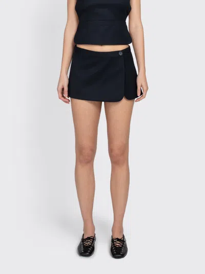 Micro skort in Black Suiting Built in shorts and button closure at side Low rise Made in NYC Model is 5'11 and wears size 2.