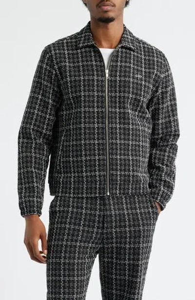 Build out your black-and-white collection with a textured tweed jacket closed with a gleaming zipper. Front zip closure Spread collar Elastic cuffs Front welt pockets Lined 100% polyester Dry clean Imported