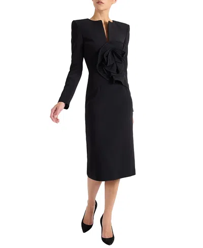 SANTORELLI Maya Long Sleeve Midi Dress With Dramatic Floral Applique In Stretch Crepe In Black