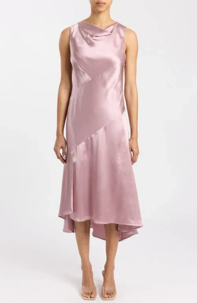 Sleeveless Midi Sheath Dress in Silk Charmeuse Sleeveless Midi Sheath Dress in Silk Charmeuse A-Line Silhouette with Slightly Flared Skirt Front High-low Skirt Side Skirt Slit with Overlap High Cowl Neckline Front Diagonal Seam Detail Approx. Length: 46" Shoulder to Hem 100% Silk Charmeuse Dry Clean Made in Italy