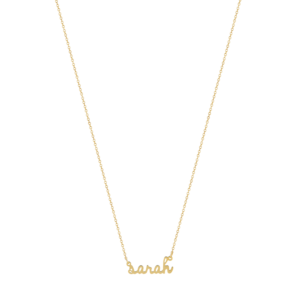 Ready to ship in 4-5 weeks. Customizable with up to ten characters, this dainty nameplate necklace is one you’ll never take off. Bonus points for the adjustable chain, which lends itself well to layering. Gold vermeil 16"-18" chain Presonalized up to 10 characters.