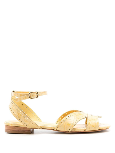 Chemisier open-toe flat sandals from SARAH CHOFAKIAN featuring light yellow, leather, embossed crocodile effect, perforated detailing, cut-out detailing, open toe, buckle-fastening ankle strap, branded insole and flat sole.
