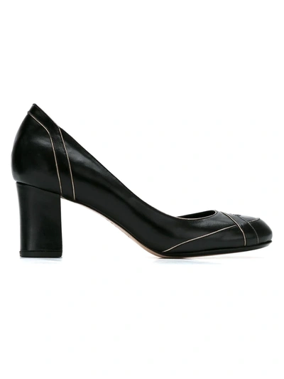 Black leather pumps from Sarah Chofakian featuring a round toe, a chunky mid-heel and cut out details.
