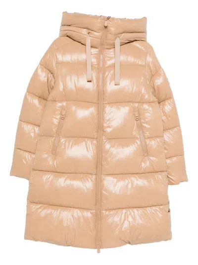 Save The Duck presents a statement piece in the form of this beige shiny puffer coat, perfectly blending style with functionality. The high collar and luxurious hood lined with soft white shearling ensure warmth, while the quilted design adds a touch of sophistication. Thoughtfully designed with a front zipper closure and two zippered side pockets, this coat embodies versatility for both casual outings and formal layers. Its slightly oversized fit and long sleeves provide effortless comfort, making it an ideal companion for any occasion. Material - Lightweight fabric Fit - Slightly oversized Features - Quilted design, front zipper closure, two zippered side pockets, hood lined with white shearling Style - Casual, puffer, quilted Gender - Women Origin - Made in Italy Care Instructions - Wipe with a soft cloth.