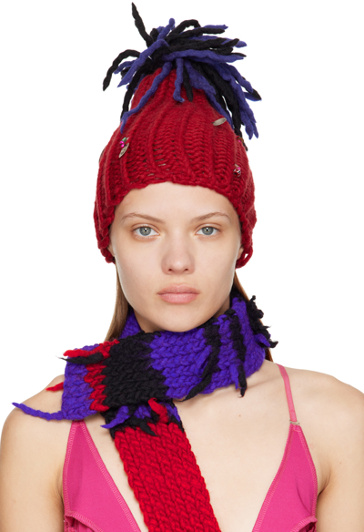Handcrafted knit wool beanie. · Graphic beaded appliqués throughout · Fringed detailing at crown Supplier color: Carnival