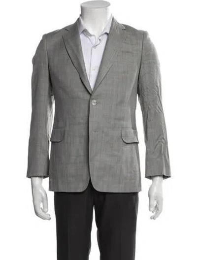 Men's grey and blue patterned Scabal Blazer with notched lapels, dual vents at back, satin lining at interior, and two button closure at front. | Scabal Patterned Blazer in Grey, Men's S