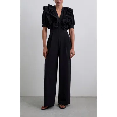 Black jumpsuit and regular fit, v-neck with ruffle detail Regular fit, V-neck with ruffle detail, puff sleeves with trim, fitted waist and full length trousers Back zip fastening Versatile design