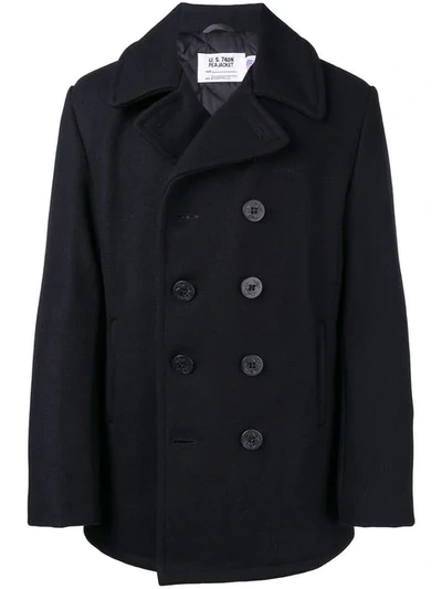 Navy wool blend double breasted coat from Schott featuring notched lapels, long sleeves, an embroidered logo to the front, side pockets and a straight fit.