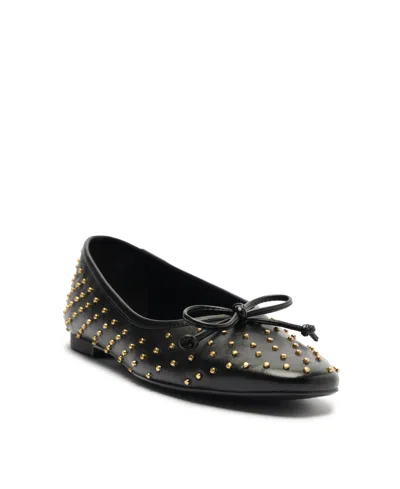 Schutz Arissa Flat in Black. Size 10, 6, 6.5, 7, 7.5, 8, 8.5, 9. Gold-tone studded embellished leather upper with leather sole. Made in Brazil. Slip-on styling. Leather footbed and lining. Bow at vamp. SCHU-WZ1546. S2071002580001. Founded in 1995 by Alexandre Birman, Schutz has redefined attainable luxury, trend-forward footwear. With each new release, Schutz delivers the most of-the-moment collections that are the hero pieces around which entire outfits are built. Defined by confident, bold, and purpose-driven attitude, Schutz shoes lead the conversation, delivering fashion at your feet, one head-turning pair at a time. In her Schutz, she can conquer anything