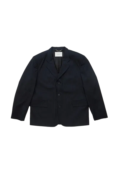 The Second Layer Barrio Blazer in grey pinstripe is a single-breasted blazer featuring a three-button closure with horn buttons and a fully lined interior.