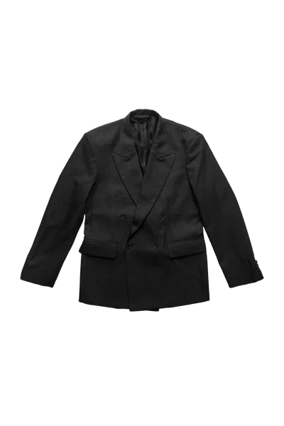 Second Layer Pico wool-blend double-breasted drill blazer featuring a classic silhouette, peaked lapel, front flap pockets, padded shoulders, and twin back vents.