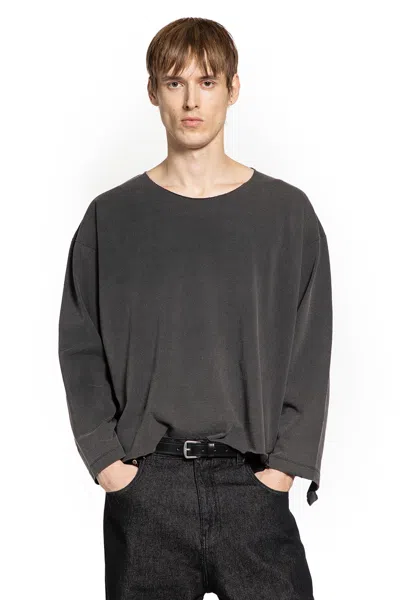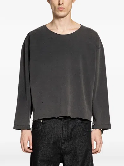 Black heavyweight Japanese cotton jersey with destroyed and distressed detailing. Dropped shoulders and long sleeves fracture classic proportions, while the cropped, relaxed silhouette and round neck reduce form to essentials. Streetwear reimagined as sculptural menswear.blackheavyweight Japanese cotton jerseydestroyed and distressed detailsround neckdropped shoulderslong sleevescropped hemrelaxed fit