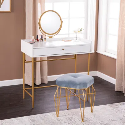 SEI Furniture, Bring bold style to your small space with this chic dressing vanity. A wide tabletop and spacious drawer provide plenty of space for makeup and accessories, while a round, gold-framed swivel mirror adds a salon feel from the comfort of your home. Tuck this small space table into your studio apartment to double as a catch-all console, or place in your master suite to make getting ready a breeze. Go sleek and sophisticated with this two-tone storage vanity.Product Information - Product Dimensions(inch) - Product Weight (lbs) - 41 Product Contents - Top/Drawer - 15Mm Mdf, 5Mm Mdf, Paper Veneer; Frame/Legs - 20Mm X 20Mm Iron, 16Mm X 16Mm Iron, 10Mm X 10Mm Iron - Mirror - 5Mm Mirror, 3Mm Iron Weight Capacity - - Country of Origin - China Assembly Required - Yes Indoor Use Only Care Instruction - Dust with a soft, dry cloth.